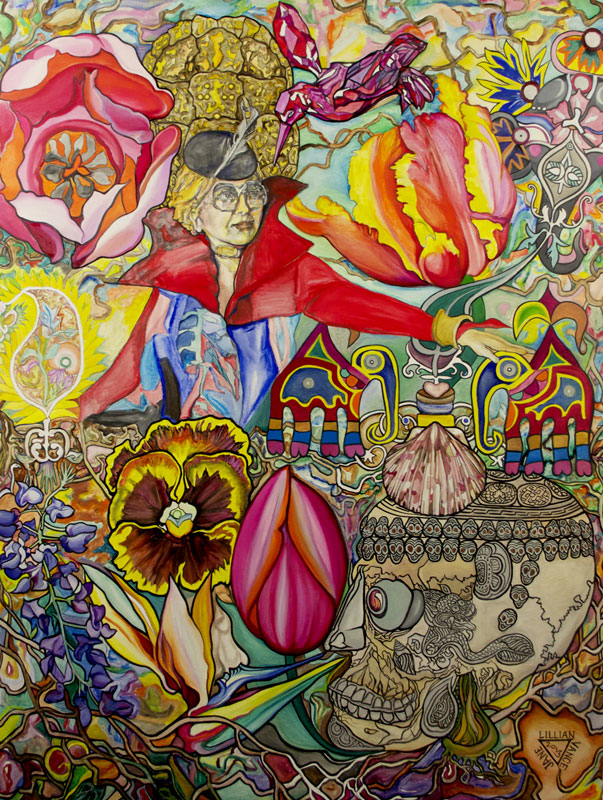 In 2013, Vance hand-delivered this portrait to Madame Helga DeSilva Blow Perera at her home, Helga's Folly, in Kandy, Sri Lanka. The Painting fills a treasured golden frame, empty for 47 years until Vance accepted the invitation to anoint it with Helga's portrait. Wearing a Phillip Tracey hat and signiature tree of life sari, Madame Helga conjures a lavish garden of tulips, bird of paradise, wisteria, and an unblinking pansy, while a crystal magenta hummingbird hovers, lured by the sweetness of Madame's mind. Ganesh sways over twin embroidery elephants who have walked free of their decorative tapestry to becoma Helga's guardian perts. A skull's base takes root, and the mind fruits with a lineage of platinum cranium-seeds, a succession of souls yet to be reborn within the lush magical loam of Helga's Dream. Visitors have only to enter the home beyone the Jane Lillian Vance Grotto to indulge in Reve Helga, the anti-hotel oeuvre of the amazing Warrior Queen.